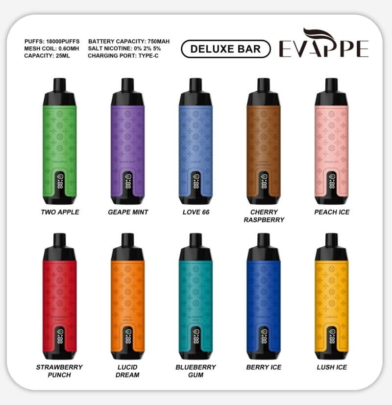 Die Evappe Deluxe Bar 18000 ist eine bahnbrechende Einweg-E-Zigarette mit LED-Bildschirm und stellt das neueste Angebot von Evappe dar. In Anerkennung der weit verbreiteten Beliebtheit von Einweg-E-Zigaretten aufgrund ihres benutzerfreundlichen Designs und ihrer Tragbarkeit überwindet Evappe die Einschränkungen der Vergangenheit, indem es innovative Funktionen einführt, die das Dampferlebnis verbessern sollen.